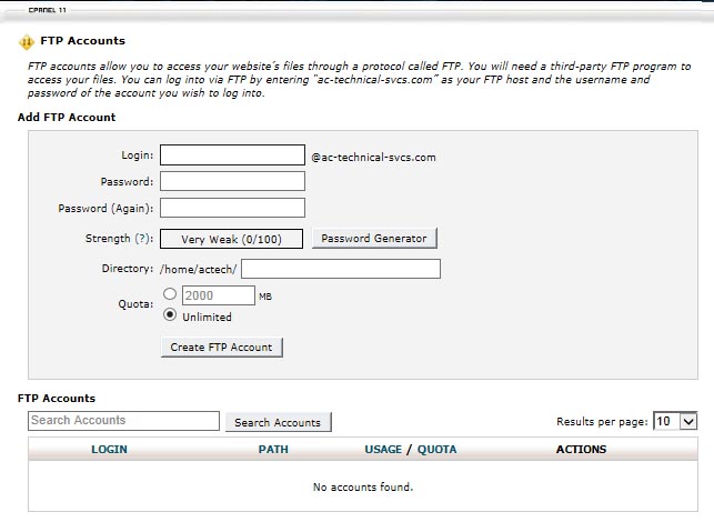 Manage FTP accounts using our control panel. You can create both standard and anonymous accounts.